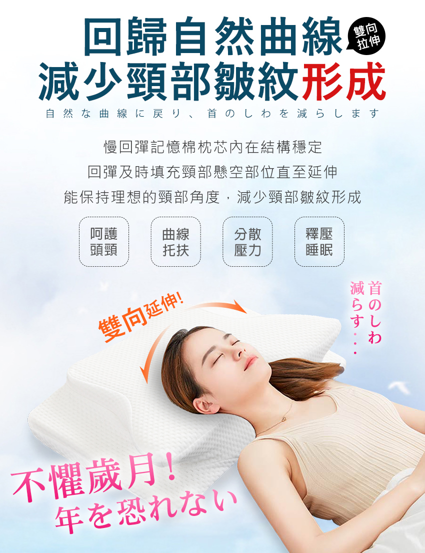 ◆雙向拉伸曲線,減少頸部皺紋形成,舒緩肩頸疲勞