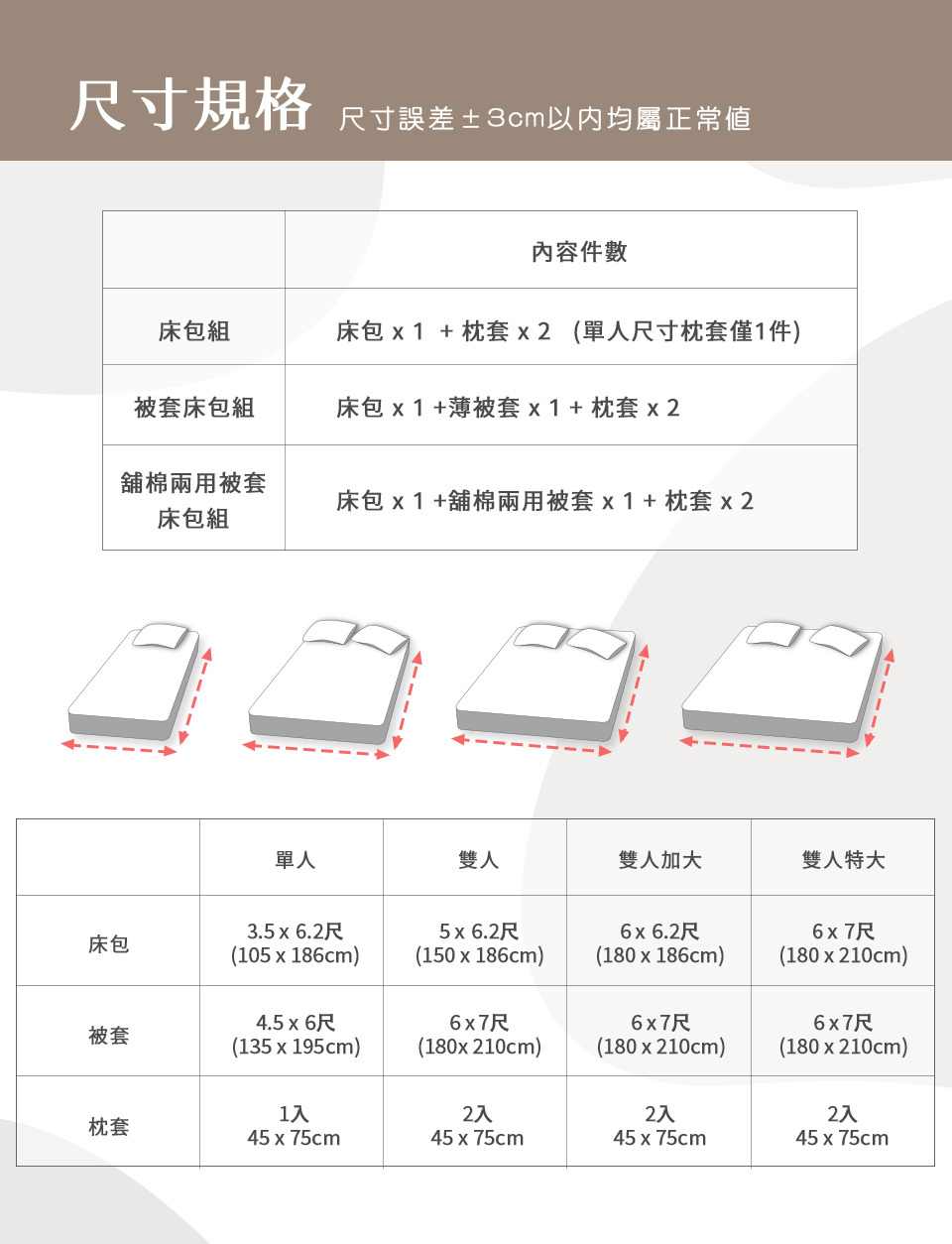 單人床包:105 x 186cm (3.5 x 6.2尺)±3cm