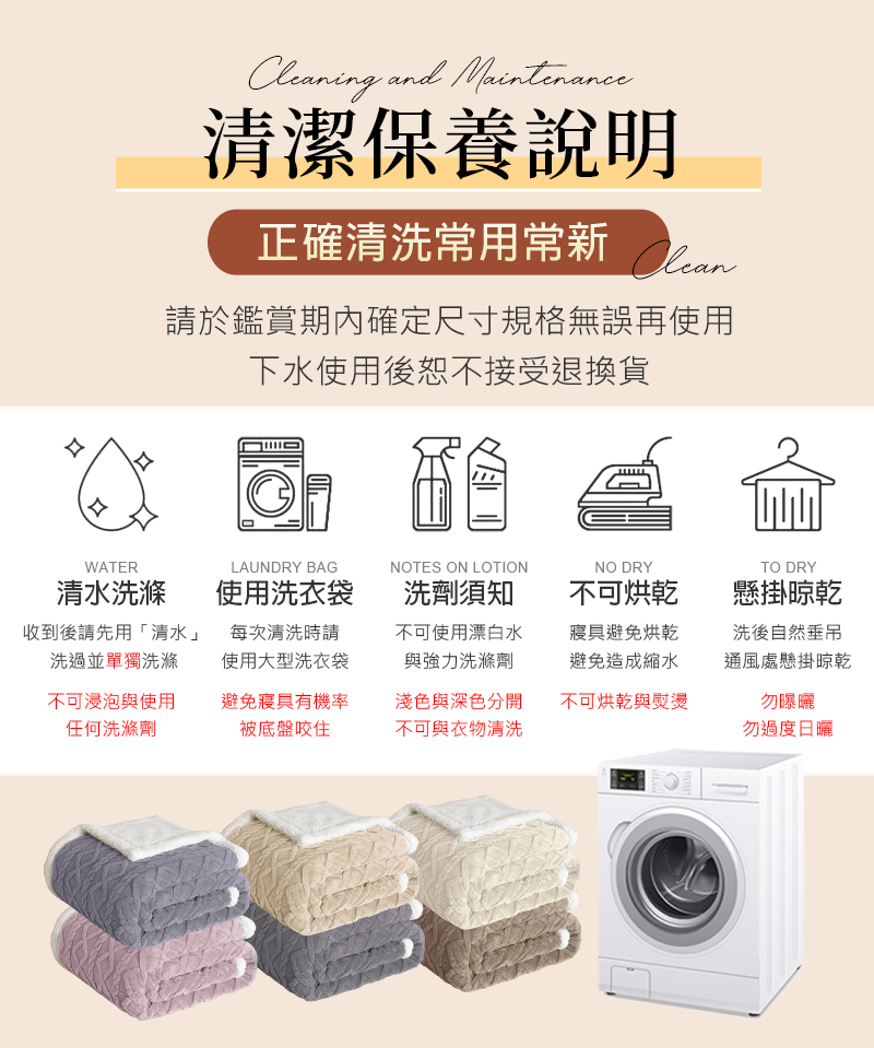 ◎毯類請單獨洗滌,避免與毛毯類、或易靜電衣物一起洗,避免表布毛絮相互作用。